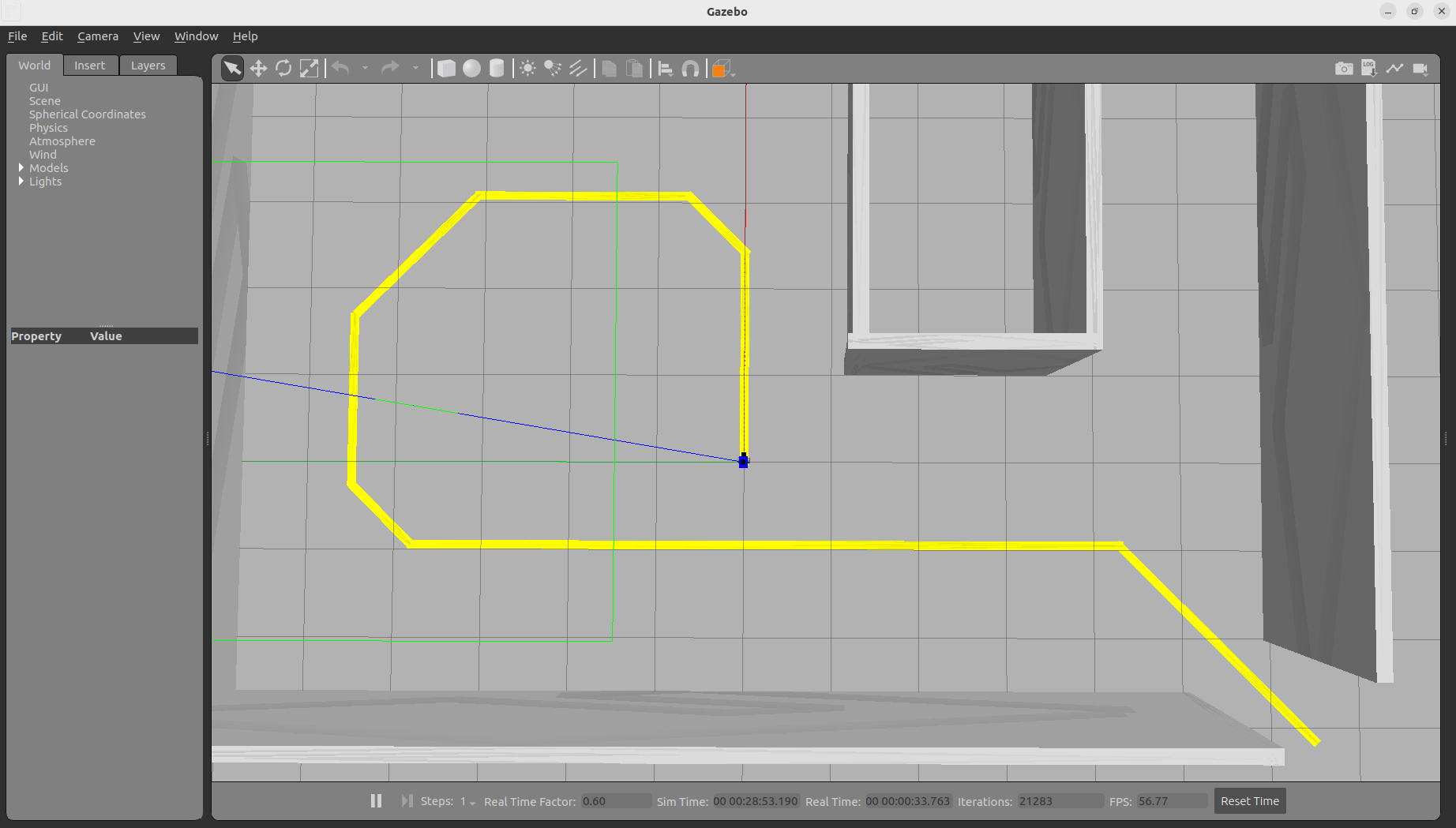After Gazebo is successfully started, you can see the yellow guide line and the simulated robot is at the starting point of the guide line.