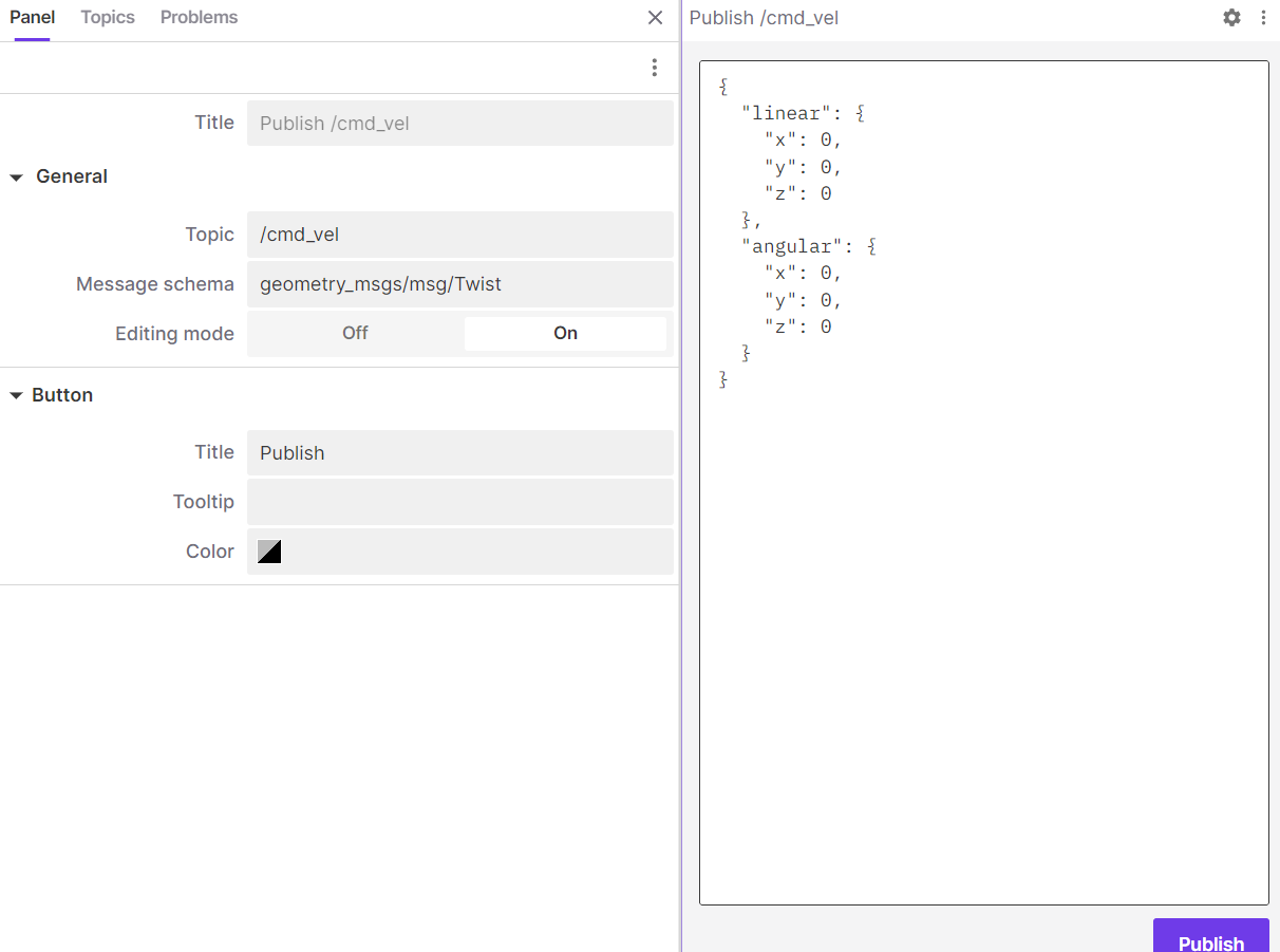 In addition to displaying topics and information, you can also use Foxglove to post topic information, such as common cmd_vel.